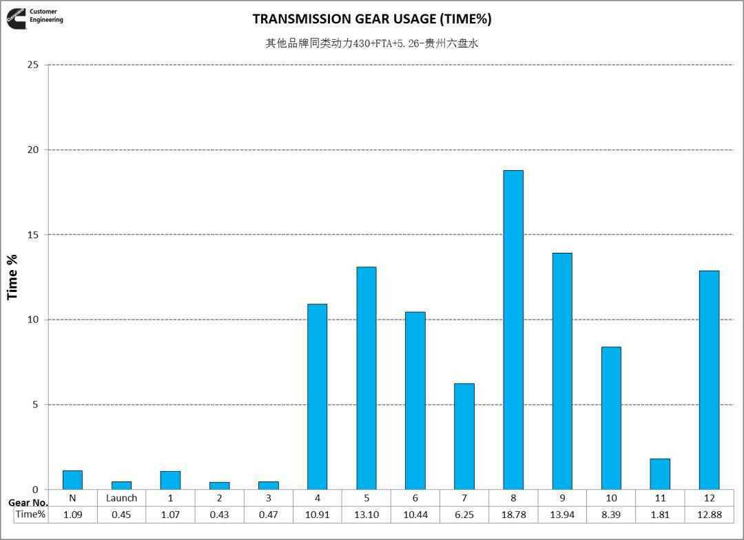 从全程挡位分布看,配置福康X12动力的欧曼自卸车整体运行挡位高于其他车辆,与用户描述的X12车辆爬坡经常比其他车辆多一个挡位相符;说明福康X12动力的重载动力性优于其他车辆。